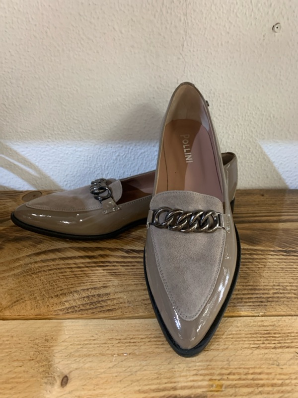 Scarpa donna Mocassino in vernice e camoscio color tortora marcate Pollini numero 39 ottime condizioni
